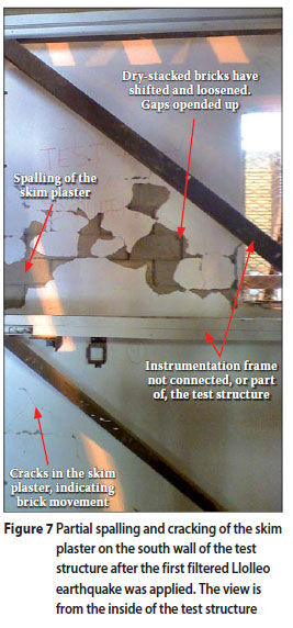 The results showed that the simulated Llolleo earthquakes caused the most damage. This damage was minor: several bricks cracked, other bricks shifted, vertical gaps opened up between the bricks, and the skim plaster spalled in several places. The Llolleo earthquake damage was estimated to be Grade 2 on the European Macroseismic Scale (EMS). During the earthquake simulations the walls deflected up to 42 mm. However, the maximum permanent deformation recorded due to bricks shifting was only 4,6 mm - a small fraction of the wall thickness. Although the peak ground acceleration (PGA) was 0,7 g, the maximum acceleration experienced by the structure at a door opening was 3,4 g.