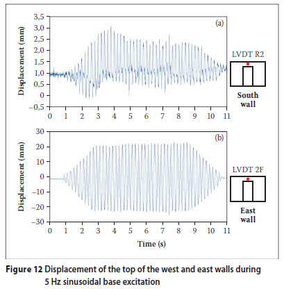 As expected, the sensor readings showed periodic responses (due to the periodic base excitation). This can be seen in the typical results of Figure 12. Depending on the location, the sensor response (both displacement and acceleration) showed a base frequency of 5 Hz, with higher superimposed frequencies. The maximum displacements (24,47 mm) and maximum accelerations (2,71 g) measured were smaller than in the Llolleo earthquake tests. The permanent, perpendicular-to-thewalls displacements were all less than 1 mm.