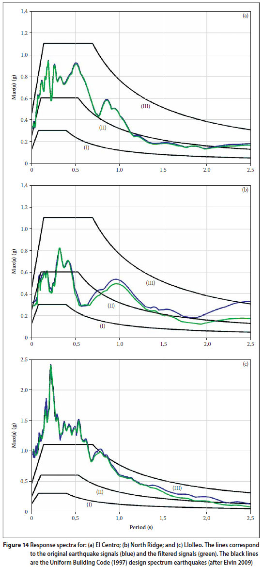 The undamaged test structure's natural frequency is approximately 5 Hz (Mofana & Rathebe 2005) or the natural period is 0,2 s. The damaged structure's natural frequency is approximately 3 Hz (Mofana & Rathebe 2005) or its period is 0,333 s. At these periods, Figure 14 shows that the applied earthquakes produce more severe loading than the design spectra: compare Llolleo to earthquake response spectrum (III), El Centro to earthquake response spectrum (II), and North Ridge to earthquake response spectrum (I). In fact, for the test structure, the applied Llolleo earthquake is almost twice the loading magnitude required by the Uniform Building Code (1997) for earthquake response spectrum (III). It can be concluded that, due to the high natural frequency of the dry-stack masonry test structure, the earthquake simulations produce conservative loads as compared with the Uniform Building Code (1997).