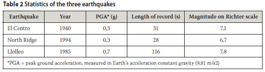 The absolute maximum base accelerations recorded during the three earthquakes studied were: 0,31 g for the El Centro, 0,32 g for North Ridge, and 0,71 g for the Llolleo.