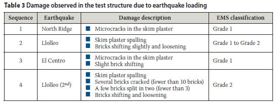 Table 3 gives a brief visual damage description and the European Macroseismic Scale (EMS) (1998) damage to the test structure due to the sequence of earthquakes. Note that the damage was cumulative as each earthquake was applied.