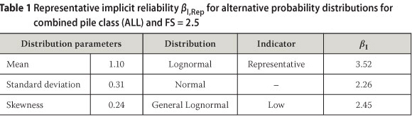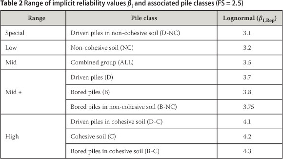 An indication of the representativeness of these values of βI across the range of pile classes is presented in Table 2. The value for βI ,Rep = 3.5 listed in Table 1 for the combined group (ALL) generally lies in the lower range of the values obtained for the various pile classes as listed in Table 2. The value of 3.5 is therefore taken to be in agreement with the approach of defining target reliability at a lower constraint value, and is thus ranked to indicate the mid-range value of implicit reliability.