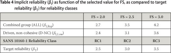 The influence of the FS-value selected in pile design on βI-estimates is shown in Table 4. For comparison, target levels of reliability (βT) are also listed, as given by SANS 10160-1:2011 for different reliability classes of building structures. The comparison indicates reasonable agreement between βI, Low for FS(2.0, 0.5 and 3.0) and βτ for reliability classes (RC1, RC2 and RC3}. The values for βI, Rep generally exceed that for the corresponding βτ showing a trend of widening of the difference for the higher FS values and reliability classes.