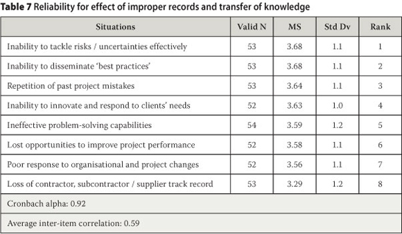 The motivation for the questions that pertain to this hypothesis came about based on the view that within an organisation, KM may even have the same degree of importance as labour, plant and materials (Fernie et al 2003 cited by Sommerville & Craig 2006: 62). This is because construction knowledge is created through the actions of individuals, project teams, organisations and the interactions between tacit and explicit knowledge in the project life cycle, which facilitate decision-making in the implementation of projects (Egbu & Robinson 2005: 35-36). Thus, Table 6 suggests that the individual mean scores of the variables relative to inadequate documentation and transfer of knowledge can be safely combined into a single mean with a good internal reliability of 0.81, and the variables can also be deemed to be correlated with average inter-item correlation of 0.47.