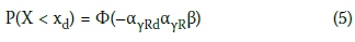 Therefore P(X < xd) = ф(-0.7 x 0.8β) = ф(-0.56β). For the target β of 3.0, corresponding to the reference reliability class RC2 for which reliability procedures are specified in SANS 10160, this corresponds to P(X < xd) = ф(-1.68) = 0.05. This gives a probability of observing a lower value than xd of 5% (i.e. a 5% fractile). Therefore xd s essentially a design fractile at 95% confidence level. Although a 5% fractile is generally interpreted as a characteristic value, here it should be strictly interpreted as design fractile corresponding to a target β of 3.0. In the context of model factor, Bauduin (2001, 2002, 2003) interprets the 5% fractile, that if pile load tests were performed, there is only a 5% probability that the measured capacity will be lower than the predicted. This also means that there is a 95% chance that measured capacities would be greater than the predicted capacities, which gives a safe design situation.