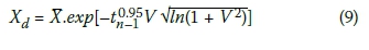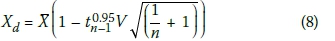 where Xd = the design fractile which in the context of model uncertainty data is equivalent to γr, d , X = mean of the model factor for a given pile class, V = coefficient of variation of the model factor for a given pile class, n = number of pile cases considered, and t0.95n-1 = student t factor for 5% fractile and n-1 degree of freedom.