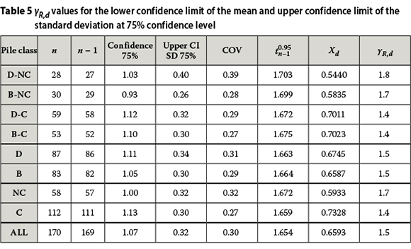■ A single value for the resistance model uncertainty factor of γr d = 1.4 (pile class ALL, Table 4) is close to the present value of 1.5 stipulated by SANS 10160-5:2011. This is not surprising, since the stipulated value is based on a preliminary analysis of information from Dithinde (2007) as reported by Day and Retief (2009). The upper confidence value of 1.5 (Table 5) indicates that γr,d = 1.4 is a proper best estimate value.