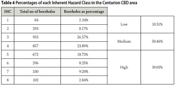 Table 4 indicates the distribution of the Inherent Hazard Classes in the Centurion CBD area, with most of the boreholes (953) falling into IHC 3, followed by IHC 4 (857) and IHC 5 (672).