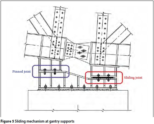 Figure 5 shows the connection with the sliding mechanism between the pylons and steel gantries. The lower parts of each steel gantry, outlined in blue, are restrained from free movement and are fully pinned in all three global directions. The top parts of each steel gantry, outlined in red, have a sliding connection, but only in the global X-direction. The contact surfaces of the sliding connections, which have slotted holes, are made of Teflon. Taking into account that the static and kinetic friction coefficients between Teflon surfaces are both 0.04, the friction forces can be neglected. This means that the top part of the steel gantry has a sliding support with a finite sliding length. If the size of the movement reaches the size of the allowable gap, the sliding mechanism will lock and neighbouring pylons will be linked. Therefore the steel gantry between these pylons will then play the role of a strut or a tie, depending on the loading condition.