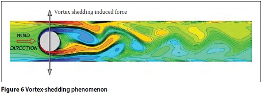 Vortex-shedding occurs when wind airflow vortices are shed alternately from opposite sides of the pylons, as shown in Figure 6. This is an additional loading of the structure acting in the transverse direction. This effect can occur at relatively low wind speeds and gives rise to a fluctuating load perpendicular to the wind direction. Structural vibrations may occur if the frequency of vortex-shedding is close to any of the natural frequencies of the pylons.