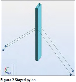 Four cables were provided on each side of the first three pylons. Each cable was post-tensioned to 100 kN. It is estimated that the maximum load in the cables during dynamic wind effects will increase to 150 kN per cable. The cables are anchored to adjacent foundations and temporary stress blocks. Introduction of the cables changed the static system of the pylons from a pure cantilever to that of a continuous beam with elastic support. Therefore, the natural frequencies of the pylons changed and had to be recalculated. One elegant way to calculate the natural frequency is to use FE software. The problem was that the available FE software at that time did not support modal analysis with geometric non-linear cable elements. The easiest way to address this problem was to replace the cable element with an elastic support that had the same stiffness as the cable element. Table 2 contains a summary of forces in the pylons due to the wind load during the construction stage. It can be seen that the bending moments about the global Y-direction, caused by the wind acting in the global X-direction, are reduced by 30% with the implementation of the cables. The calculated axial force in the cable elements was smaller than the expected maximum of 150 kN.