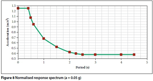After locating the site on the seismic hazard map from SANS 0160-1989 (SANS 1989), it was decided to use a ground peak acceleration of 0.05 g. The normalised response spectrum is shown in Figure 8. The client requested that the behaviour of the structure should remain elastic during seismic activity and therefore the seismic behaviour factor used in this case is equal to one. The pylons are also vulnerable to possible seismic action during the construction stage, especially in the longitudinal direction of the conveyor before the steel gantries are in their final position.
