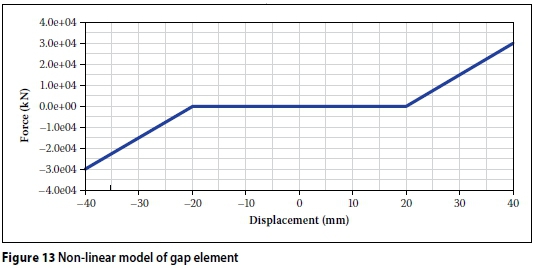 It is recommended that, if possible, the automatic gap elements that are part of FEM software should be used for static loading. Because these automatic gap elements are non-linear, each load combination must be analysed separately. For dynamic analyses, such as modal and response spectrum analyses, it is recommended that soft beams be used to calculate the periods of oscillation and force distribution. Additional hand calculations using the equivalent lateral force method can be performed to compare the results from the response spectrum analysis with the FEM results.