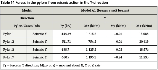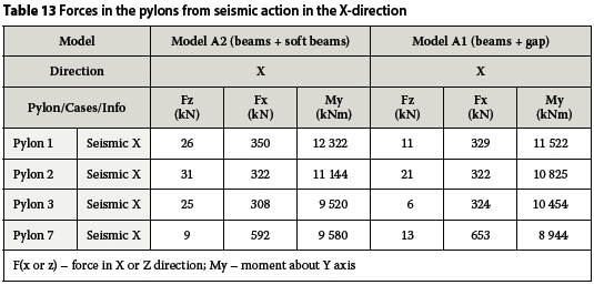 The parameters used for the seismic analyses during the operational life of the structure are identical to those used for the analyses during the construction stage. The acceleration a = 0.05 g and the behaviour factor is equal to one. Two FE models were considered and analysed. Model A2, the model with beam elements and soft beams, was analysed first. From the modal analyses, the natural frequencies of each pylon were determined. Using this information, the equivalent static lateral forces for each pylon were calculated and applied in the FE beam model with automatic gap elements, Model A1. A summary of the results for seismic action in the X-direction is given in Table 13. Some of the results differ by up to 10% because, in order to calculate equivalent static lateral forces by hand, it is assumed that the whole mass of each pylon is subjected to the same pseudo-acceleration. This FE model has a more representative mass distribution, leading to more accurate results.