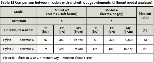 The modelling of the sliding connection behaviour was a major focus of this work. To highlight the diversity of results between the FE models with and without gaps, Tables 15 and 16 are presented. Table 15 compares the spectral analysis results for the FE models with and without soft beams. Even though the period of oscillation in the FEM without a gap is shorter and therefore the applied lateral load is larger, the bending moment in the first pylon is much smaller. In this case the gantries are effectively tying the pylons and transferring the force to the stiffest seventh pylon.