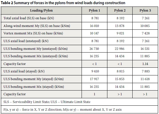 The loading and behaviour for both the construction stage and the operational stage were considered. The concrete pylons, being tall and slender structures, should be checked for possible vortex-shedding effects and it was shown that the additional forces induced by these effects could not be neglected. The wind loading is the most critical loading factor during the construction stage. If the ground acceleration is higher than 0.5 g, then seismic loading could become the most critical loading condition.