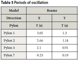 From Table 3 it can be seen that for the first three (tallest) pylons, the moments about the global X-axis are much higher than those around the global Y-axis. This is to be expected, because the moment of inertia around the global X-axis is much higher. Therefore, the section is stiffer in that plane and the period of oscillation is shorter, as is shown in Table 5. As a result of the shorter period of oscillation, the pseudo-acceleration is higher and the lateral force induced by inertia is larger, causing higher moments at the base. For the seventh pylon, the periods of oscillation are almost identical, which is reflected by the very close values of the bending moments at the base.