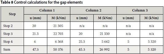 To perform a more direct comparison, the results of the modal analysis from the FEM with soft beams are used and the same equivalent lateral static load is applied to the FE model with automatic gap elements and the one without gap elements. The results are presented in Table 16. It can be seen that the moment in the first pylon is 2.5 times smaller, while the moment in the seventh pylon is 2.25 times larger. The difference between the force distributions is a result of the presence of the sliding joint. The shear force from seismic loading in the system without sliding connections will travel to the stiff pylon. On the other hand, in the system with sliding connections, the shear force induced by seismic action will be distributed to each pylon before the sliding mechanism is locked. The force distribution depends on the stiffness of each pylon.