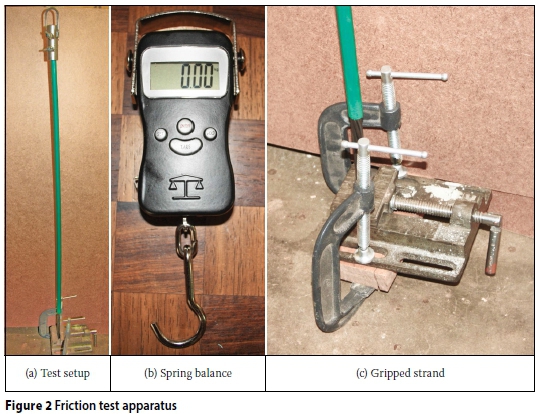 The friction test was conducted according to the test procedure outlined in EOTA ETAG 013 (2007), Annex C. A total of five different coils were supplied, and three specimens per coil were tested. All specimens were 1.2 m long. For each specimen, the weight of the strand, wires, grease and plastic sheath (including its thickness) had to be measured. The weight of the grease was established by weighing the lubricated strand. After that the grease was washed off the strand and the strand elements reweighed. The apparatus required to perform this test are shown in Figure 2. Of the 1.2 m length of the strand, 0.2 m length was exposed to facilitate the clamping process. Once the strand was clamped, the spring balance was hooked to the plastic sheath. The spring balance was then pulled up by hand until the sheath started to move and the force on the spring balance was constant. The force required to move the sheath was recorded and the procedure repeated for the other specimens.