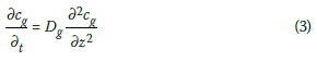 ∂c / ∂z is thus the concentration gradient, and in transient state, allowing for the conservation of mass, the governing differential equation is given by Fick's Second Law (Rowe 1998):