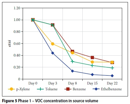 Phase 1 results show that over the 22-day diffusion test period, the VOC concentrations in the source decreased and the VOC concentrations in the receptor increased. The detection of VOC concentrations in the receptor started on day 8 and increased to between 10% and 30% of the original source concentration at day 22. The VOC concentrations in the source immediately decreased as the VOC sorbed onto the HDPE GM, and gradually decreased over the 22-day testing period to between 5% and 30% of the original source concentration. Measured losses can be attributable to sorption of the VOCs onto items such as the stainless steel cell, the septa, the gaskets or the screw in the filling port, but since great care was taken to limit losses due to sorption to these areas, the most plausible reason for the losses would be due to the sampling process. Phase 1 testing met its objective of proving that the VOCs in question diffuse from the source, through the 2 mm HDPE GM, into the receptor that represents the groundwater, and the diffusion coefficients obtained compare well with those from literature.