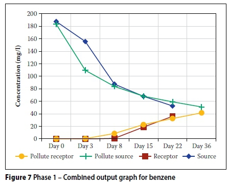 The concentration versus time output graphs that POLLUTE® produces if the methodologies described earlier were correctly followed, were combined with the actual laboratory test results and are shown in Figures 7 to 10 for Phase 1 testing.