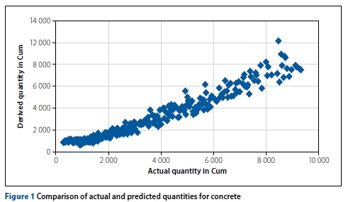 The plot between actual quantity (from out-of-sample data) and the derived quantity (sample data) for concrete validates the model, as shown in Figure 1 The alignment of plotted points along the line of equality indicates the robustness of the model.