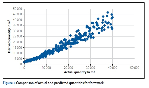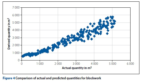 The plot between actual quantity (out-of-sample data) and the derived quantity (sample data) for plastering validates the model, as shown in Figure 5 The alignment of plotted points along the line of equality indicates the robustness of the model.