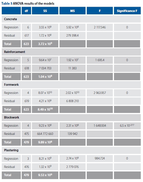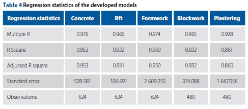 The value of significance 'F' in Table 5 is less than 0.05 for all five the models, which implies that the developed models are significant. The collinearity statistics for all the independent variables is established indicating that the variance influencing factor (VIF) is greater than '1' in each case. However, multi-collinearity between the independent variables exists, as the VIF is more than '2'. For example, in concrete work the two independent variables of concrete pump hours and transit mixer hours have strong multi-collinearity because, without a transit mixer to deliver concrete, the concrete pump resource will not be useful.