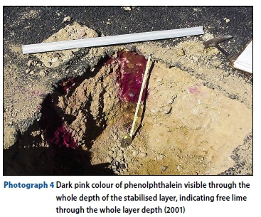 4. Phenolphthalein colours the cement-stabilised material pink when the material has not carbonated and remains colourless when carbonated, and therefore shows that the road investigated in 2001 had not carbonated (see Appendix).