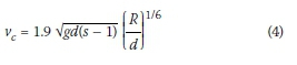 The scaling challenge is further demonstrated by the empirical equations which over-predict the critical velocity for the peach pip particles (as shown in Table 2), because they do not account for density, unlike Gao et al (1993), Hancu (1971) and Equation 4. It is derived from the Shields diagram that assumes the shear stress limit for incipient motion for Re > 400 is tc= 0.056ps- p)gd (Graf 1971). The Hancu (1971) model for scour depth relies on a critical velocity that is also derived from the Shields diagram and proves to be one of the more accurate scour equations in the subsequent section.
