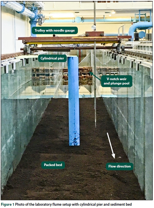 Experimental work was conducted at the Civil Engineering Hydraulics Laboratory, Stellenbosch University, in a rectangular flume with a 40 m length, 1 m width and 1.24 m depth. A sediment bed was packed in the flume around a scaled pier model, and water was released to emulate channel flow and local scouring. The tests were performed for subcritical flow under clear-water conditions (Froude number Fr < 0.26 and critical velocity ratio v/vc < 1) and for a constant water depth y = 0.2 m which was manually controlled with a sluice gate at the downstream end of the flume. A V-notch weir controlled the inflow and a plunge pool with tubes aligned the flow to ensure that uniform, fully developed flow would reach the pier after a 9 m entrance length. Figure 1 shows a photograph of the experimental setup.