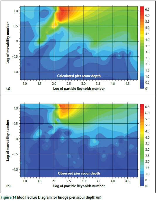 As an alternative to the new proposed empirical equations, the diagram in Figure 14 relating Rep, v*/w and ds is comparable to the Modified Liu Diagram for incipient motion and has the potential to predict bridge pier scour, even though the pier structure parameters are omitted.
