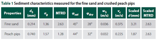 The material properties measured for the two sediments, presented in Table 1, were the median particle size d, maximum theoretical relative density MTRD or s, angle of repose φ, settling velocity w and critical velocity vc. Both sediment beds may be classified as uniformly graded based on the par ticle size distributions ag = (dg4/d16)as< 2. These values were obtained from standard sieve analyses, rice density tests, fixed funnel tests and settling column tests.