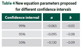 The standard HEC-18 equation with the new proposed factors for armouring and pier shape are presented. The standard factors should be used for the bed condition with clear-water scouring Kb = 1.1 and for alignment Kq = (cosO + L/DsinO)0.65. The a and b coefficients in Table 4 were determined for different confidence intervals, for while a good design equation with a higher confidence interval may guarantee fewer under-predictions, an empirical equation with a lower confidence interval may yield more accurate predictions. Adopting a new approach with confidence intervals can quantify the trade-off between accuracy and unsafe under-predictions, offering flexibility to the bridge designer.