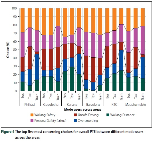 Combining these findings there are obviously differences between mode users in the different areas, for example Walking Safety for minibus taxi users ranges from 11.9% in KTC to 3.9% in Philippi. For train users Travel Delays range between 12% in Masiphumelele to 4.1% in Barcelona. Nevertheless, for certain attributes, regardless of area and mode, there will be similarities in perception. Analysis shows that the context of actual realities on the ground is a driving factor in people's perception of public transport experience. It is thus important to make site-specific considerations when designing any public transport infrastructure in informal settlements.