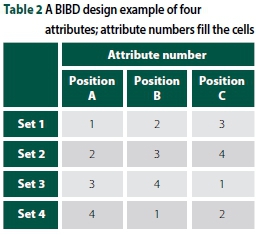 Early executions of Case 1 analyses were conducted using so-called 2J designs (Flynn & Marley 2014), so named because for J objects there are 2J best-worst choice sets that are possible. Issues around using this format of choice set design arise only from psychological phenomena, as the size of the choice sets is not constant; for instance, respondents can view choice sets with a small number of objects as the more important ones (Louviere et al 2015). To avoid these problems, Balanced Incomplete Block Designs (BIBD), which stem from combinatorial mathematics, are most commonly used now. A BIBD guarantees that the occurrence and co-occurrence of all objects (or attributes) is constant, therefore reducing the propensity of respondents to make assumptions regarding the relative significance of objects.