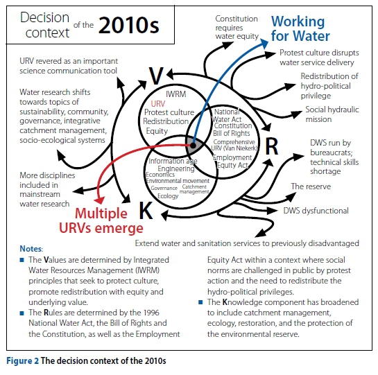 Goddard et al (2016) proposed a values, rules and knowledge (VRK) framework with which to understand how a societal system of decision processes affects the manner in which a particular problem is addressed. We apply this framework to the South African decision-making context for water resource management, comparing a model of its state in the 1980s when the URV was developed (Figure 1) to a model of its current state (Figure 2).