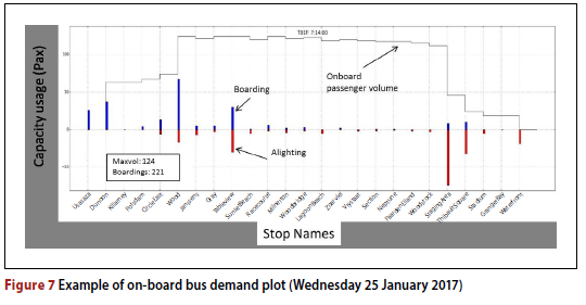 On-board bus demand plots can also be generated for every single bus departure throughout the day. Bus departure plots have station names on the x-axis and passenger numbers on the jy-axis (see Figure 7). Boardings are positive values, while alight-ings are negative values. The resultant bus occupancy due to boarding and alighting movements is tracked over the entire journey via a solid line. Approximately 4 900 directional MyCiTi bus trips were found to be generated on weekdays, and approximately 2 400 bus trips per day on either Saturdays or Sundays, which corresponds correctly with the MyCiTi timetables. For the purposes of this study, several of the simulated bus trips were scrutinised in detail to determine the efficacy of ABM outputs. It was found that in all cases the bus trips were simulated realistically, and it was possible to derive actionable supply usage intelligence, which could be used to make informed supply management decisions.