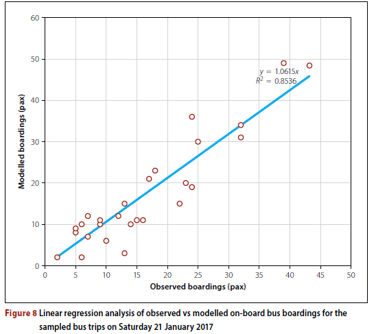 Due to resource constraints such as surveyor availability, difficulties observing passengers during congested periods, and cost implications, it was not possible to conduct a comprehensive weekday demand survey. Rather, a sample of 28 MyCiTi bus trips (95% confidence level with a 20% confidence interval relative to the number of trips on a Saturday) was collected by the authors on Saturday 21 January 2017. This was done to demonstrate the models' ability to estimate on-board bus boarding volumes. The survey was conducted over 12 hours from 8 am to 8 pm. Passenger boardings and alightings were captured for each of the surveyed trips. A MATSim simulation for the same day, 21 January 2017, was then developed using AFC data, and the outputs were further analysed. The model made various estimations in terms of boardings, and these estimations were then compared to the actual boardings based on the validation survey. From this process, the following can be noted: