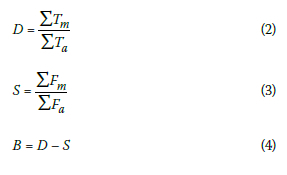 The equations used to calculate the safety value per TAZ are provided in Equations 2, 3 and 4. Firstly, the demand for transport is calculated. This study utilises the available trips as per the National Household Travel Survey (NHTS) (StatsSA 2013). The demand (D) is determined by comparing the number of trips (Tm) to all trips (Ta) in a TAZ. In a similar way, the safety (S), based on iPAS data, is calculated by dividing fatalities per mode (Fm) by the total number of fatalities (Fa) in a TAZ. The final safety value (B) is determined by subtracting safety (S) from demand (D).