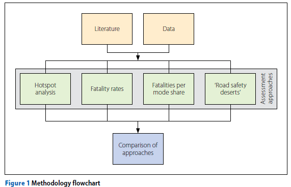 Based on a literature review and available data, a comparison of four different road safety assessment approaches was completed (see Figure 1). These four approaches are hotspot analysis, fatality rates, fatalities per mode share, and 'road safety deserts', a novel theory detailed in this study.
