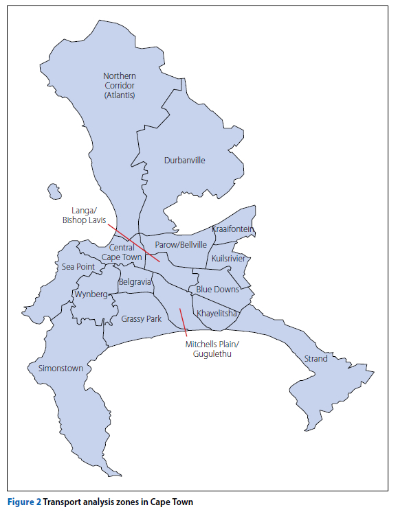 In this study, the City of Cape Town (CoCT) was separated into 16 transport analysis zones (TAZs), which are the smallest geographical areas used for city-wide travel demand model forecasting (see Figure 2 on page 21).