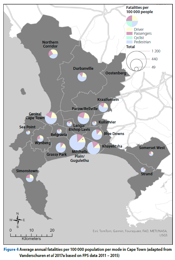 A study completed by Vanderschuren et al (2017a) used road fatalities per 100 000 population to assess the state of road safety in Cape Town, using transport analysis zones (TAZs) as the geographical areas to be assessed (see Figure 2). Total fatality data, obtained from CoCT's FPS for 2011 -2015 (CoCT 2015b), was converted to average annual fatalities per 100 000 population per mode for each TAZ (see Figure 4 where the pie chart size indicates the total number of fatalities). The reader should note that, while the FPS data should be closely aligned to the definition of a road fatality, as defined by the WHO (2013), there is no guarantee. The authors, therefore, caution regarding direct comparison of the WHO and local fatality rates.