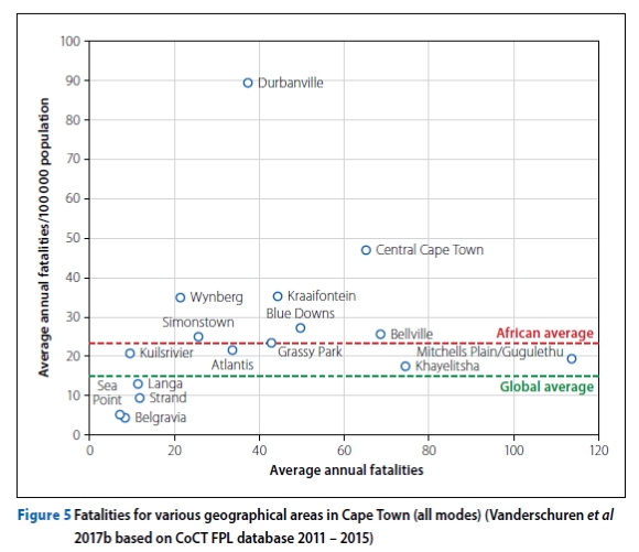 An interesting finding of the study by Vanderschuren et al (2017b) was the significant differences between absolute fatalities per TAZ, compared to the fatality rates per 100 000 population. This is illustrated in Figure 5. Without going into too much detail regarding the results, it is very clear that the TAZ that needs intervention based on absolute fatalities (Mitchells Plain, which is a high-density suburb) differs from the TAZ based on fatality rates per 100 000 population (Durbanville, a suburb with some major mobility corridors that are less congested and, therefore, have higher speeds and, hence, more fatalities, than mobility corridors closer to the CBD of Cape Town).