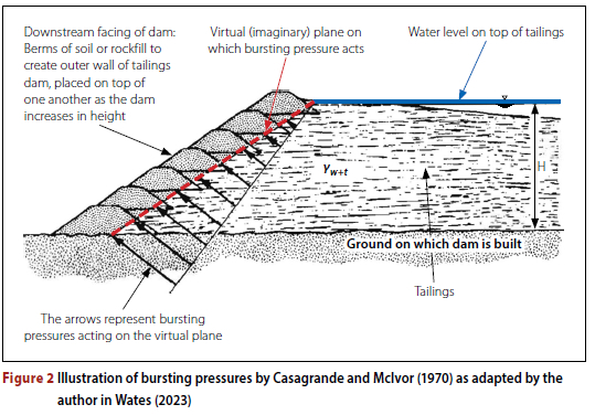 Casagrande and Mclvor (1970) stated that the shell that provides resistance to failure of a tailings facility must be of sufficient width to retain "bursting pressures". Casagrande and Mclvor's definition of a bursting mechanism is illustrated in Figure 2 (as adapted by Wates 2023).