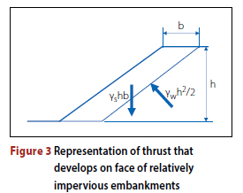 Limit equilibrium analysis using the method of slices, does not adequately model the "bursting' pressures to which Casagrande and Mclvor (1970) were referring, since pore pressure is assumed to dissipate down the face of an embankment or at the interface with a drain that intersects the phreatic surface. Limit equilibrium models assume that the pore pressure at the base of each slice is equal to the product of the elevation difference between the free surface and the slice base multiplied by the unit weight of water. For the bursting mechanism the pressure is equal to the elevation difference between the point of exit of the phreatic surface and the base of the slice multiplied by the unit weight of water. Limit equilibrium analysis, using the method of slices, might therefore not correctly represent the Brumadinho case, since low permeability embankments may have allowed full hydrostatic pressure to build up behind the embankments (referred to as containment berms in the Brumadinho sections) if the drains were not fully functioning and adequately sized, or if drill holes were to introduce water into the drains at a rate faster than the water could be discharged. The equilibrium between the thrust (bursting pressure) arising from the hydrostatic pressure that exists behind relatively impervious embankments and the resisting mass is illustrated in Figure 3 on page 31.