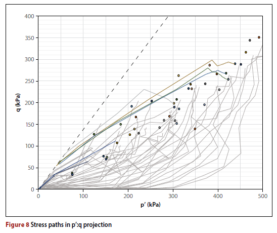 Figure 8 provides the stress paths for development of the facility for selected points with the dots indicating the stress state when the void is introduced with water pressure still applied, and the colour paths show the stress development of a few of the queried points which fall on the shear zone of the failure once the water pressure is removed. All experience a decrease in mean effective stress and loss of strength, and the paths all move towards the CSL (black dashed line). The plots in the e:p' projection confirm und-rained behaviour in the zones as there is no change in void ratio and confirm that realistic results have been obtained from the analysis.