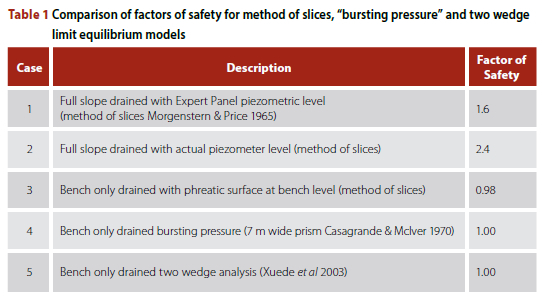 Table 1 compares the results of the calculations for the method of slices (Morgenstern & Price 1965) with the "Bursting Pressure" factor of safety (Casagrande & Mclver 1970) and the adapted Xuede et al (2003) model.