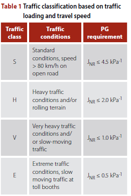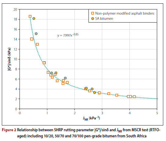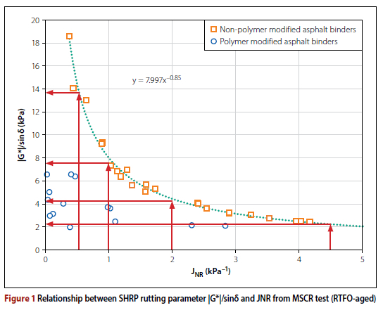 Figure 1 shows that a direct relationship exists between |G*|/sinδ and Jnr for non-modified binders. However, in the case of modified binders no such relationship was found. This supports the concept of grade bumping (i.e. specifying one to two grades higher than required by the environment) which has been used since the mid-1990s. However, as research was conducted with the MSCR and modified binders, it became clear that the concept of grade bumping, as applied with non-modified binders, cannot be applied in the same simplistic manner. With the MSCR test the same specification requirement is applied but at different values of JNR specified at the given pavement temperature. This is the approach followed in the SA PG specification. Unfortunately, standard programs on the DSR equipment provide only the use of the USA standard of |G*|/sinδ, but this standard is not in the SA PG specification, so if used, the binders would be classified incorrectly. The correct approach to apply with the SA PG specification is discussed in this technical note.